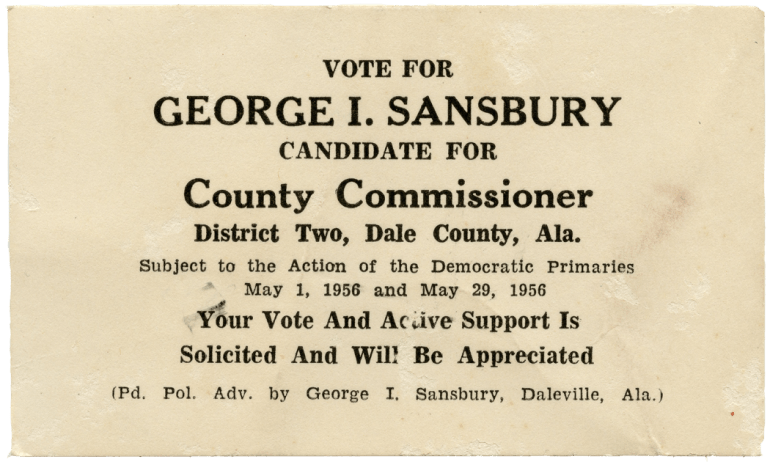 1. George I. Sansbury election campaign card, 1956; privately held by Jen Sansbury, [address for private use], Texas, 2018.